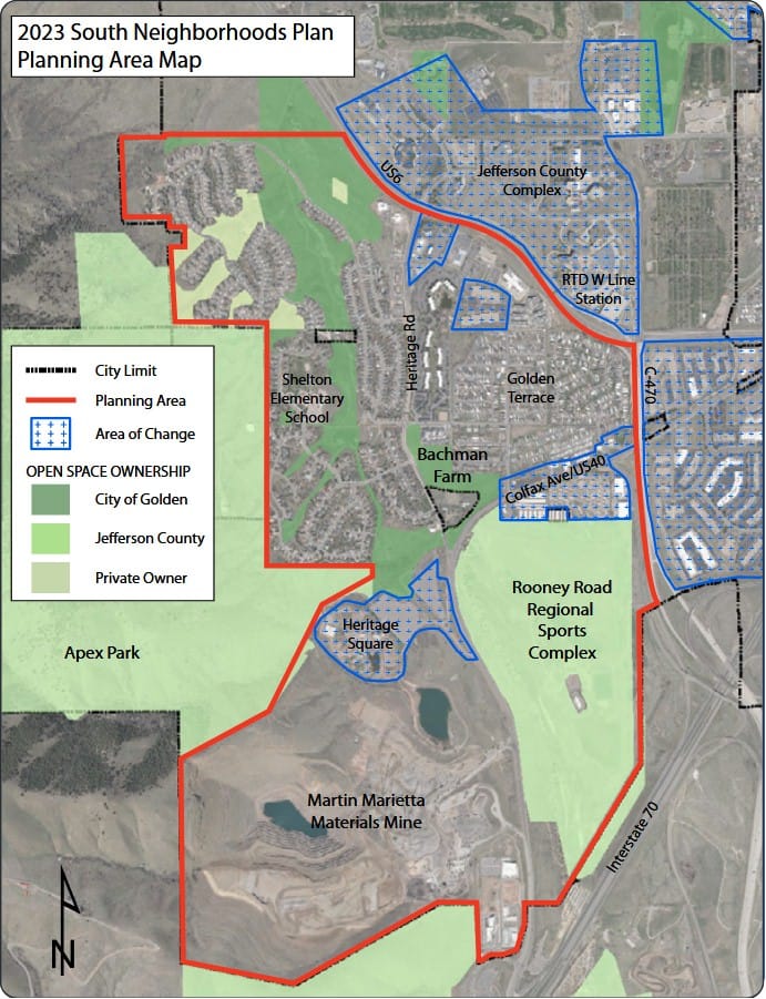 Planning Commission will be asked to approve the South Neighborhoods Plan. This document with be used in combination with many other City and County plans (including Jeffco Open Space, Golden Open Space, Transportation, Bike & Pedestrian, Housing Needs, Affordable Housing, Comprehensive Plan, Racial Equity, Diversity, and Inclusion). The plan includes several improvements to walkability and bikeability. The areas where significant change is anticipated are outlined in blue on the map above. They expect the former Heritage Square to be redeveloped as well as the West Colfax corridor. A copy of the plan is included in tonight’s meeting packet (scroll down to page 15).