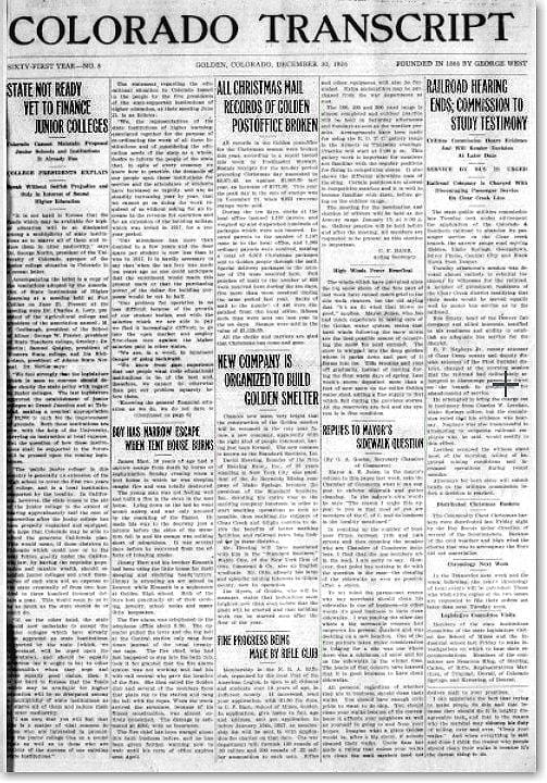 Thanks to the Golden History Museum for providing the online cache of historic Transcripts, and to the Golden Transcript for documenting our history since 1866!