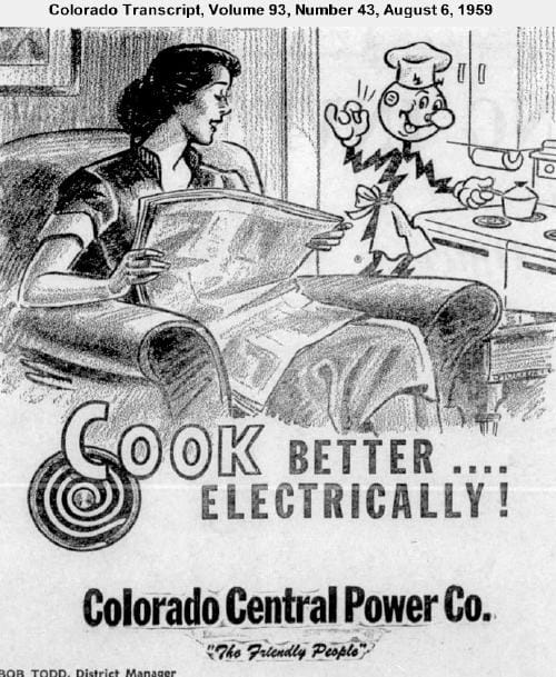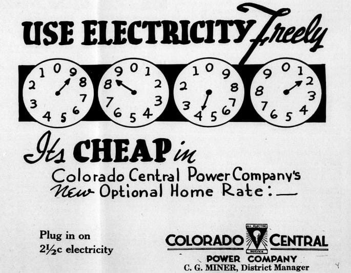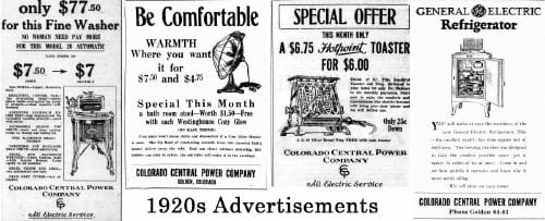 1926 Several regional power companies, including Jeffco Power & Light were consolidated to form Colorado Central Power Company. The new company covered Golden, Morrison, Englewood, Littleton, Fort Lupton, Plattevill, Johnstown, Milliken, Hudson, and Keenesburg. The new company’s main offices were in Golden, on Washington Avenue. The new company continued to push electrical appliances, but by this time they had competition from other stores, including Linder Hardware, just down the street. They began advertising that cooking with electricity was cheaper and cleaner than cooking with coal or wood (no soot).