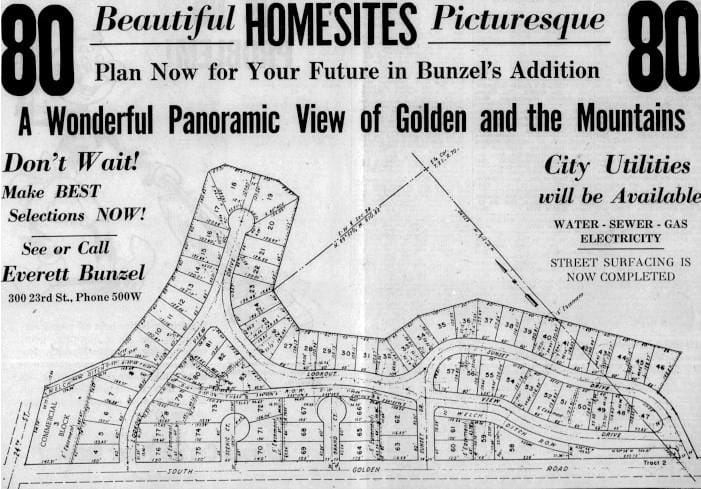 In 1945, he bought several more lots in that area for back taxes. The land had belonged to the late Charles Quaintance (who owned the Castle Rock Funicular). By 1947, Bunzel was selling “Beautiful Building Sites in one of Golden’s Most Desireable Residential Areas.” These sites were within the Welch Addition.