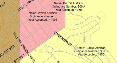 You may have heard the terms “Welch’s Addition, and “Bunzel’s Addition,” to refer to certain neighborhoods. The original boundaries of the City of Golden were laid out in 1871. Since that time, we have annexed many additional parcels to be part of the city, and those terms are sometimes called “additions.” At other times, the City’s annexation map just shows the name of the developer or some other descriptive name; for example–“Morey Gibson, year accepted 1969,” or “Tripp Ranch, year accepted 1988.”