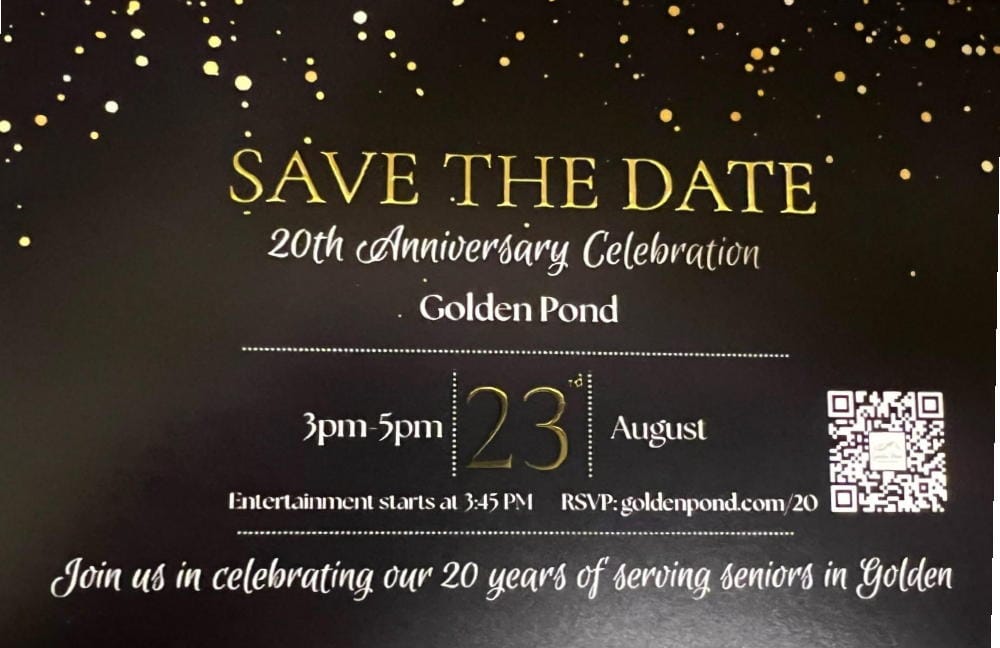 Golden Pond Retirement Community is celebrating their 20th Anniversary this afternoon! If you have friends who live there, friends who work there, might want to move there, or just want to help a Golden business celebrate a major milestone, stop by this afternoon between 3 and 5PM!