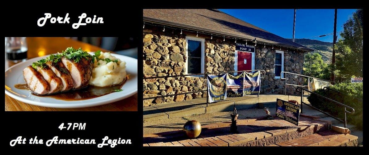 Pork loin, mashed potatoes, gravy, vegetable, roll and dessert. Free for Veterans and $13.00 for everyone else...the public is welcome!