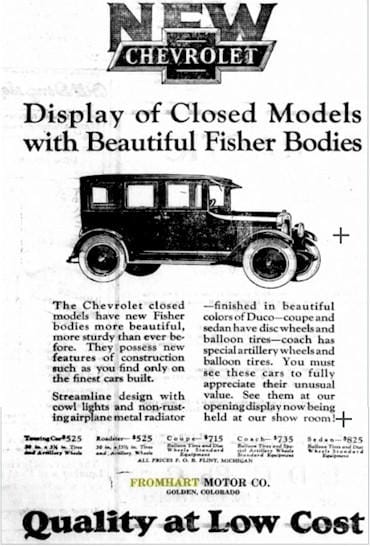 Fromhart, the former blacksmith, became the Golden Chevy dealer in 1923. He was located at 13th and Ford.