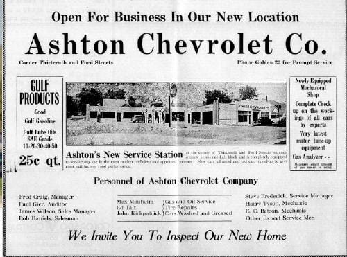 In 1936, Ashton Chevrolet moved into the old Fromhart property at 13th and Ford Street. This location offered better access for their service department, and allowed room to add gas pumps.