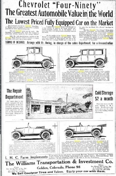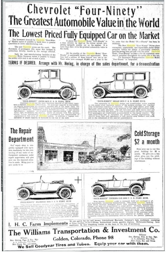 In the early days of automobile sales, dealerships didn’t seem to come with territories, and several businesses in Golden sold Chevrolets. One of the first Chevrolet dealers in Golden was the Williams Transportation Company. This was run by “Cement Bill” Williams, who built the Lariat Loop road. If the building (shown in the middle of the ad) seems familiar, it may be because it’s still around, and now serves as Woody’s Pizza.