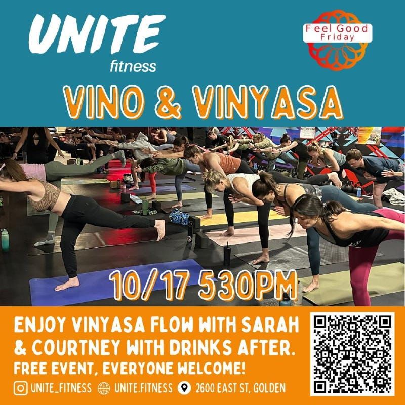 Join Unite Fitness for Feel Good Friday Vino & Vinyasa on October 17th 530PM – Enjoy Vinyasa Flow with Unite Yogi's Sarah & Courtney then unwind with drinks after and get to know your Unite community!