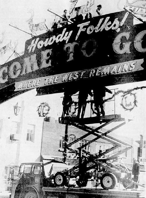 The Golden Jaycees took the lead on the decorating, and Coors contributed the equipment to help them reach the arch and light poles.