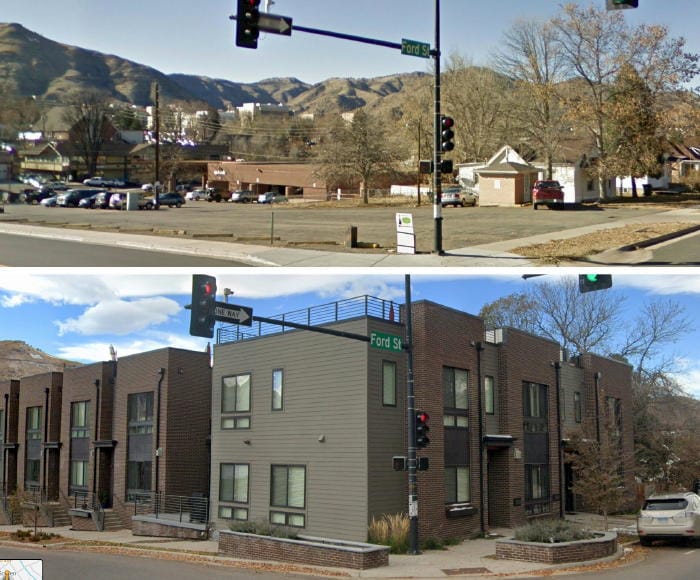 That corner remained a parking lot for more than 40 years, but in 2018, twelve town homes were built there.