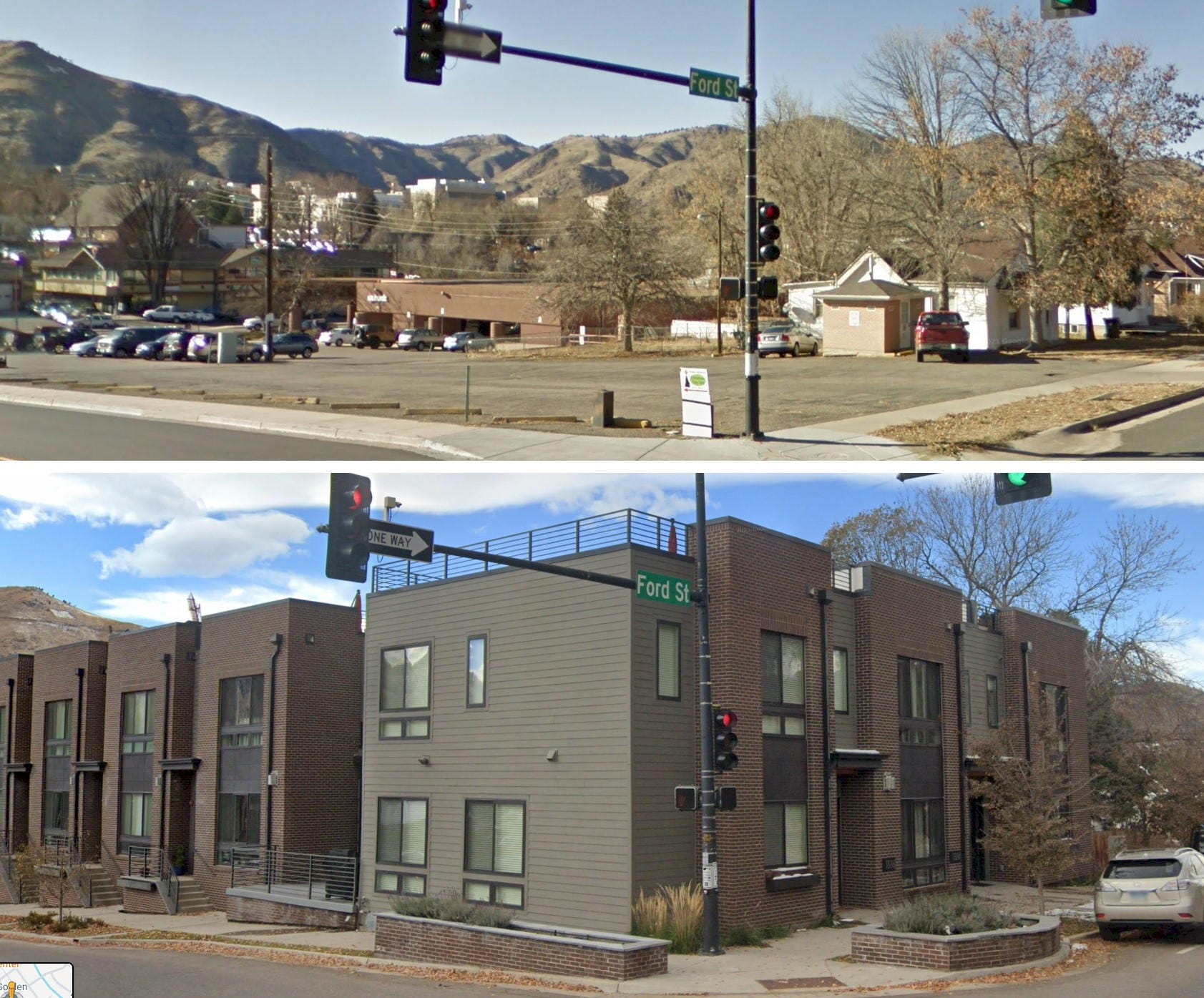That corner remained a parking lot for more than 40 years, but in 2018, twelve town homes were built there.