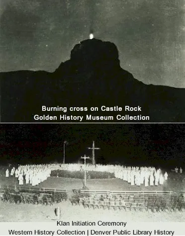 The Klan chapters throughout the Denver metro area held their gatherings on Castle Rock, above Golden. They drove out to Golden on “the cement road” (Colfax). The automobiles would be stopped by robed and hooded Klansmen on horses and their identities checked before they were allowed to proceed up South Table Mountain towards Castle Rock. During their meetings, they burned crosses which, according to the Transcript, were at least 50 feet high and could be seen for miles around. The Transcripts dated 4/20/22, 9/27/23, and 10/23/23 describe the meetings.