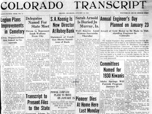Ninety years ago, the January 16, 1930 Colorado Transcript announced that the publishers would be donating their archive of 1867-1897 Colorado Transcripts to the State Historical Society. Vera West Parsons, the Transcript’s publisher and daughter of Transcript founder George West, planned to present them to Governor William H. Adams. “The presentation has been characterized as one of the most valuable ever given to the society. Data of much historical value is contained in the files, and they will prove of great value for research work in the early history of Colorado.”
