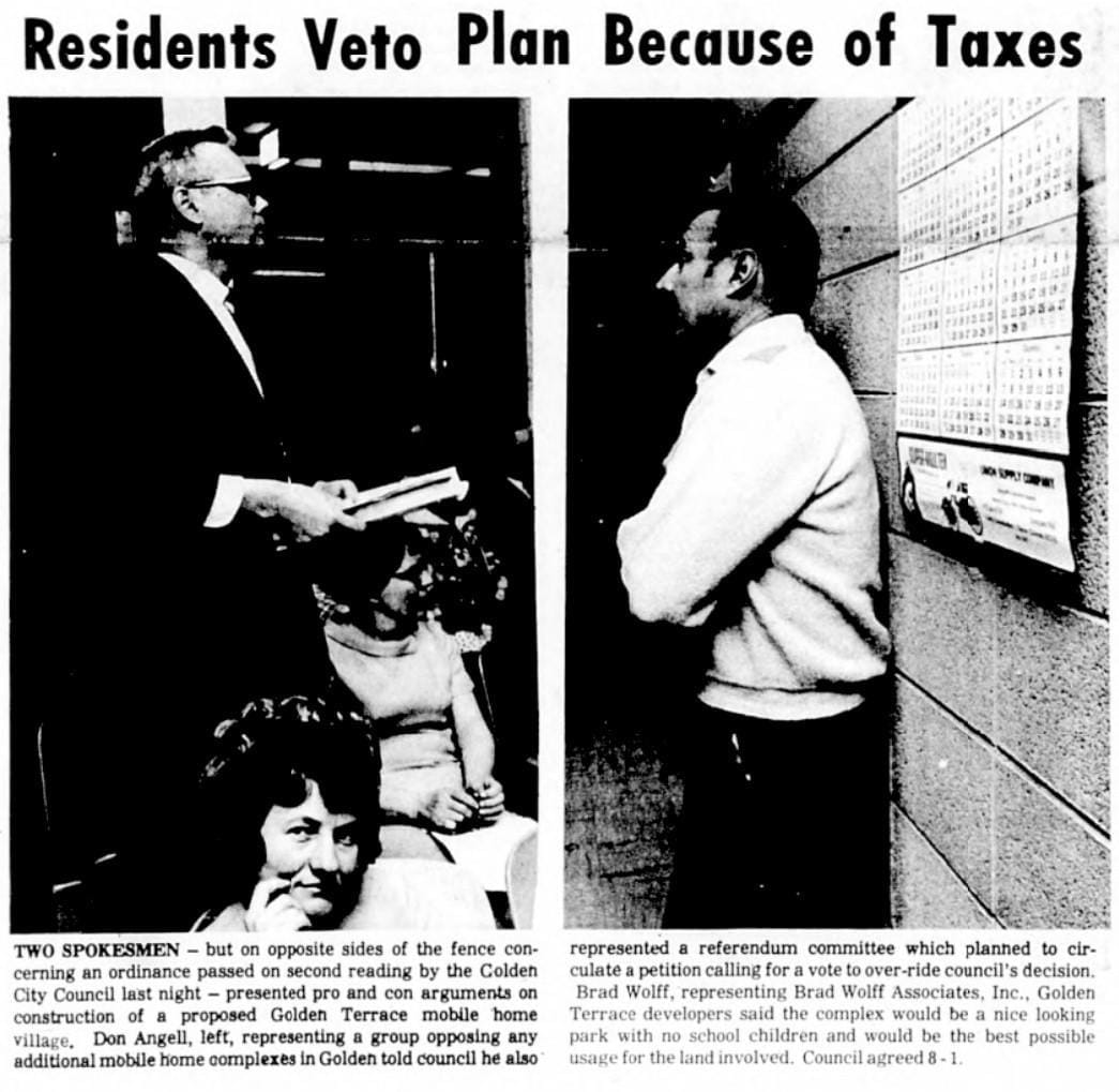 WE FEEL THE increased population of a trailer park of this size would increase the need for additional fire and police protection, adding additional costs to the other Golden residents.... WE FEEL GOLDEN has enough trailer parks within its city limits. With this addition Golden and Pleasant View will have 1,089, or 55 percent of the trailer sites in the county. We feel that Golden will suffer rather drastically because we will have an image of being a trailer city. While we are not saying trailer parks are undesirable, we are saying the excessive number of trailer sites within the Golden area will damage Golden’s very real potential for development of quality home building. Angell said there is no real assurance that Wolff will be able to keep his promise of no school children in the development, nor any assurance that when Wolff sells the park the new owner will honor this commitment. He also said that they didn’t believe trailer parks contribute their fair share of taxes, using figures he said showed trailers pay only about 30 percent of what a single family residential unit pays for occupying the same property or acreage.