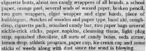 Prior to World War II, it was rare to see a reference to trash or litter in the newspaper. After the War, the references began to appear every few months, and by the 1970s, they came in a deluge. As I noticed this, I couldn’t help but wonder–did people suddenly become more prone to dropping trash, or did we just suddenly begin to care? The answer, of course, is both.