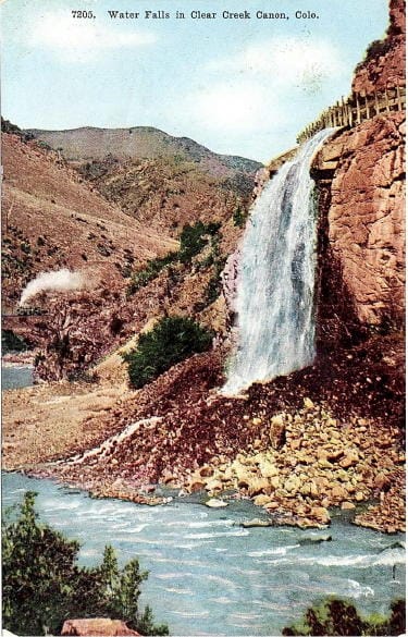 This interesting postcard shows water from the Welch Ditch overflow weir cascading down into Clear Creek. The location is just west of Golden near the present-day entrance to Hwy 6 Tunnel No. 1. Just visible on the left side of the view is a small section of the railway track and a steam locomotive drawn in by hand. Photographers, from which the postcards were usually made, almost never waited around for a train to come. They just took the image and had the train drawn in later back in the studio.