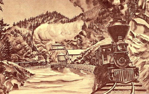 Just beyond “Inspiration Point”, in this artist’s view looking down the canyon, was the Beaver Brook station at the point where Beaver Brook enters Clear Creek. This location is also in the canyon section bypassed by Tunnel 2. Scheduled train time for the 7.6 miles from Golden to Beaver Brook was 45 minutes in 1882.