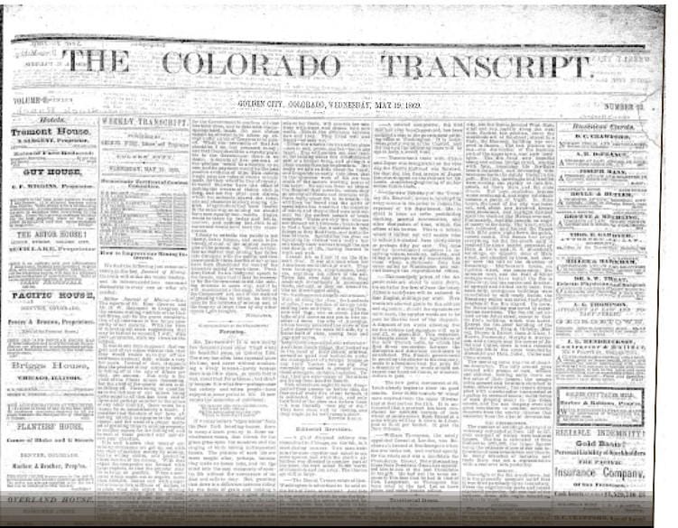 The Colorado Transcript has been covering Golden since December of 1866. It was a valuable resource for Golden residents of the time, but may be even more valuable for those of us who like to know what life was like during Golden’s pioneer days.