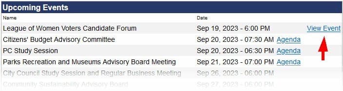 About 1 minute before the meeting start time, a “View Event” link will appear on the agenda page. If you don’t see it on the page, refresh/reload the page until it shows up. Then click on “View Event.”
