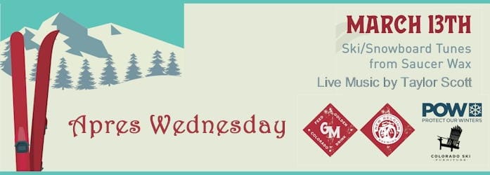 The Golden Mill will celebrate the season tonight with ski/snowboard tunes by Saucer Wax and live music by Taylor Scott. 5-8PM