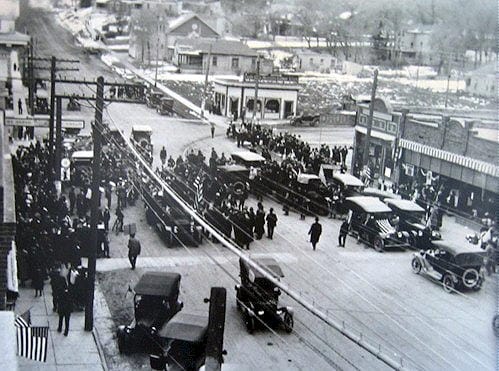 The “day” began at one minute after midnight, when bells around town rang. The boys who were in the trenches last year or overseas were the fellows who made the most of it and as one said, “Let me ring that bell awhile; no one is more glad to celebrate this day than I am. Last year at this time we were in the dugouts and we had orders to move in the morning. If the armistice hadn’t been signed when it was I’m afraid you would have had a long list of boys on that card above the Liberty Bell, who made the supreme sacrifice.“