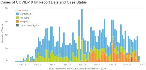 Jefferson County’s case count page says that as of 3PM yesterday, there have been 2,610 cases in Jefferson County (up from 2,590). There have been 171 deaths (unchanged!) and 368 are hospitalized (also unchanged!). There are 213 known cases in Golden (up from 212).