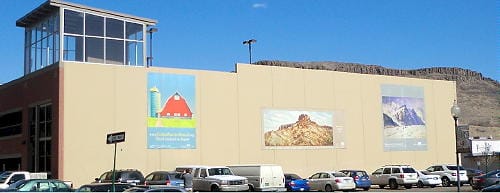 Speaking of art: in looking through old photos last night I came across the photo above, taken in 2011. GURA had built the parking garage, but the buildings at either end had not yet been constructed. In order to soften the look of the tall, unadorned walls, GURA ordered large vinyl prints made of paintings by local artists and hung them on the north and south ends of the garage.