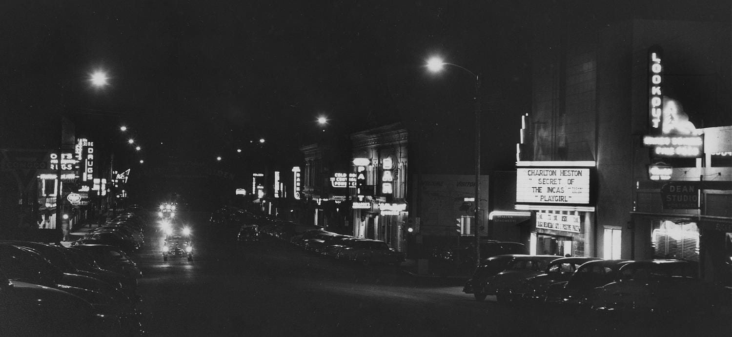 Neon was popular in the 1950s! Even non-glitzy businesses such as a paint store, the power company, and a furniture store had big neon signs. We can date this photo by the movie showing at the Golden Gem. Secret of the Incas was released in 1954.