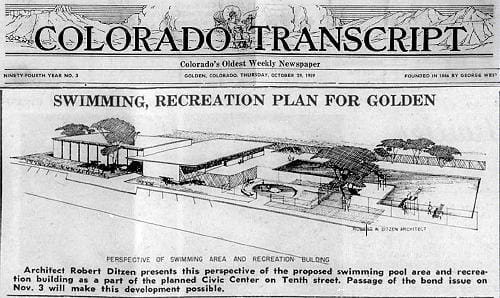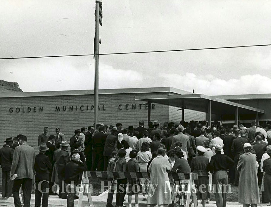As Golden approached its 100th anniversary (which would occur in June of 1959), Golden’s leaders–particularly the Chamber of Commerce–determined that we had outgrown our pioneer-era City offices. In the spring of 1958, Heinie Foss, owner of the Foss Drug, led a committee to plan a new complex of buildings that would include the city offices, police and fire departments, a swimming pool, library, museum,and recreation center.