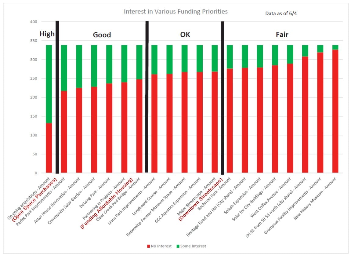 They will also review the report from the Investment Task Force. The Task Force has been meeting for several months to evaluate the “wish list” of possible expenses that we’ve compiled through many years of public meetings. They employed several methods of polling the public, but got the highest number of responses (340) through the GuidingGolden poll. Citizens were asked to vote yes or no on whether they wanted to fund various items. If their “yeses” were going to cost more than $15million, they were asked which kind of tax increase they would support in order to pay for the projects. The taxing options included an increase in sales tax or property tax, initiating a lodging tax, or legalizing marijuana sales and taxing them.