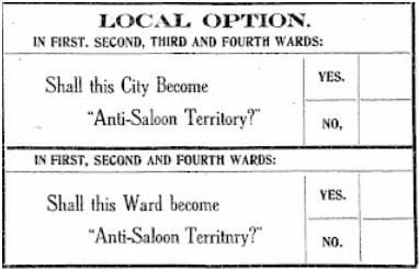 The campaign heated up over the next several weeks, with the Anti-Saloon League crowd claiming that alcohol created a wild, lawless environment. The ministers of several churches wrote a letter to the Transcript saying it was “never wholly safe for a young woman to cross the principal thoroughfare of the town after nightfall on the way to or from church or her work because of the drunken loungers furnished by the saloons.”
