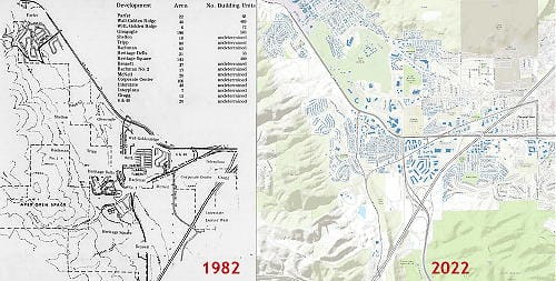 Yesterday’s “Golden History Moment” included the maps above, which showed land at the south end of Golden. In 1982, the historic ranches were on the brink of becoming suburbia. In 2022, most of that land is occupied by homes and businesses.