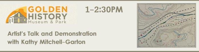 Artist Kathy Mitchell-Garton combines her fondness for Golden’s topography and landscape with her love of heirloom textiles and stitching to create artworks that explore the intersection of family, history, and place. Come hear more about her inspiration and gain insight into her artistic process in this artist’s talk and demonstration. Kathy will bring pieces from her stash of textiles and maps and demonstrate a few stitches. Museums always say ‘don’t touch’—this is your chance to get your hands on some beautiful textiles and stitching! Drop in anytime anytime between 1 and 2:30PM.