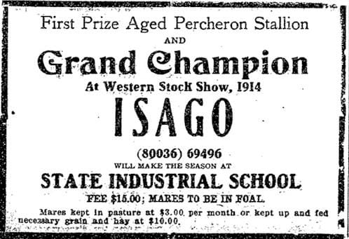 The June 4, 1914 Colorado Transcript included this display ad, offering stud service from the School’s award winning Percheron stallion. This horse had been a consistent prize-winner since the School acquired it in 1911.