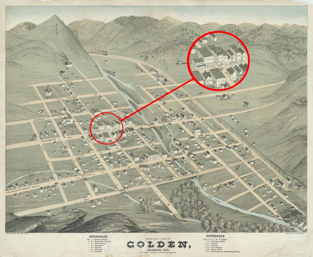 The July 10, 1867 Colorado Transcript reported that a blacksmith shop at the corner of 12th and Washington had burned down the previous weekend. The building was uninsured and owners figured the loss at $1200. They immediately began rebuilding at 12th and Ford.