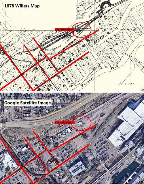 I often use old maps and compare them to Google Satellite images. I highlight the street grid shown on the map and resize the Google imagine until the streets align. Here’s how I located the old freight house: