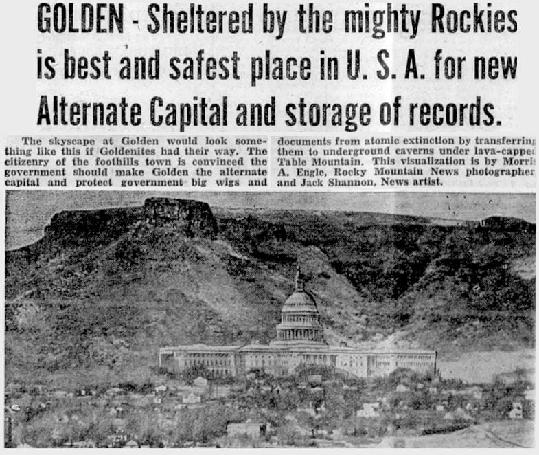 The March 23, 1950 Colorado Transcript had this picture on the front page. The Cold War was heating up (or freezing up) in 1950, and the Federal government was considering building a second capital. Our Senator at that time seized the opportunity to promote Golden and South Table Mountain as a secure alternative. The thought was that the government could burrow holes in the Mountain and set up shop there.