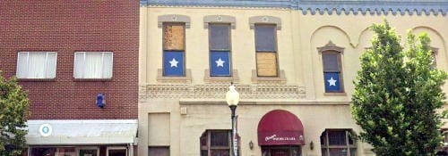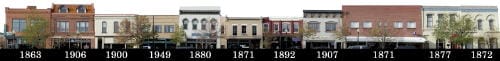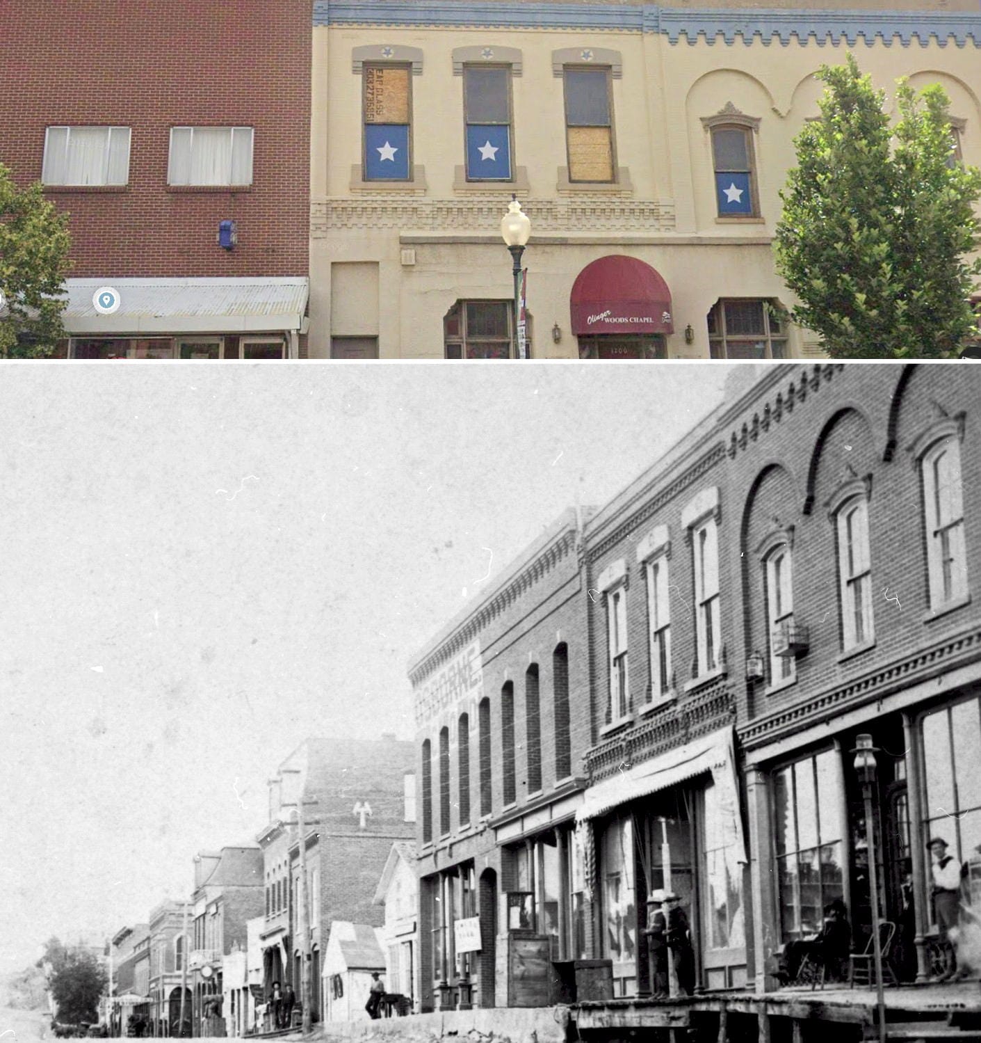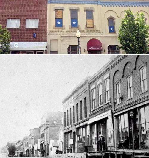 If you compare the brickwork on the two closest buildings, you will recognize the ones above and below as being the same buildings. The next building (the one that says “OSBORNE” in the old photo and contains a florist and an antique store today) is a recognizable size, but in the mid-twentieth century, the owners removed the Victorian facade and replaced it with plain brick.