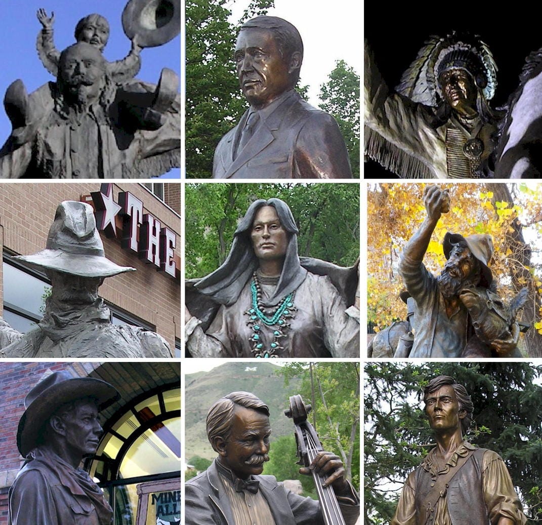 There are thirteen statues of men—Adolph Coors, Checkmate at 6th & 19th, the fly fisherman near the Golden Hotel, the prospector behind the Visitors Center, Buffalo Bill, Ben Nighthorse-Campbell near Taco Bell, the two musicians behind the Golden Hotel, the Minuteman near the history museum, the bicyclist, the kayaker, the cowboy near Miners Alley, and the other cowboy at Fossil Trace. Young boys are found in the musicians, the rodeo kids, Helping Hand, the newsboy, and Eddie at Bat. A total of 13 men and five boys.