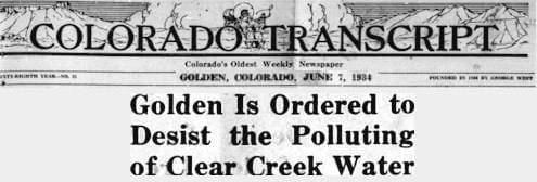 The June 7, 1934 Colorado Transcript reported that Mayor Jones had received a letter from the Colorado Division of Public Health, telling Golden to desist from dumping sewage into Clear Creek. Their charge was valid: Golden did pipe its sewage untreated, straight into the creek. This was standard practice at the time. Every city along the creek was doing the same thing, making Clear Creek a filthy, disgusting mess.