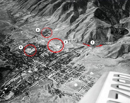 Patrick Klein (whose aerial photos often appear in GoldenToday) and I were recently discussing this interesting photo from the Denver Public Library Western History Collection. It was taken from an airplane in about 1950. As with all old photos, it’s fascinating both for what you do see and for what you don’t.