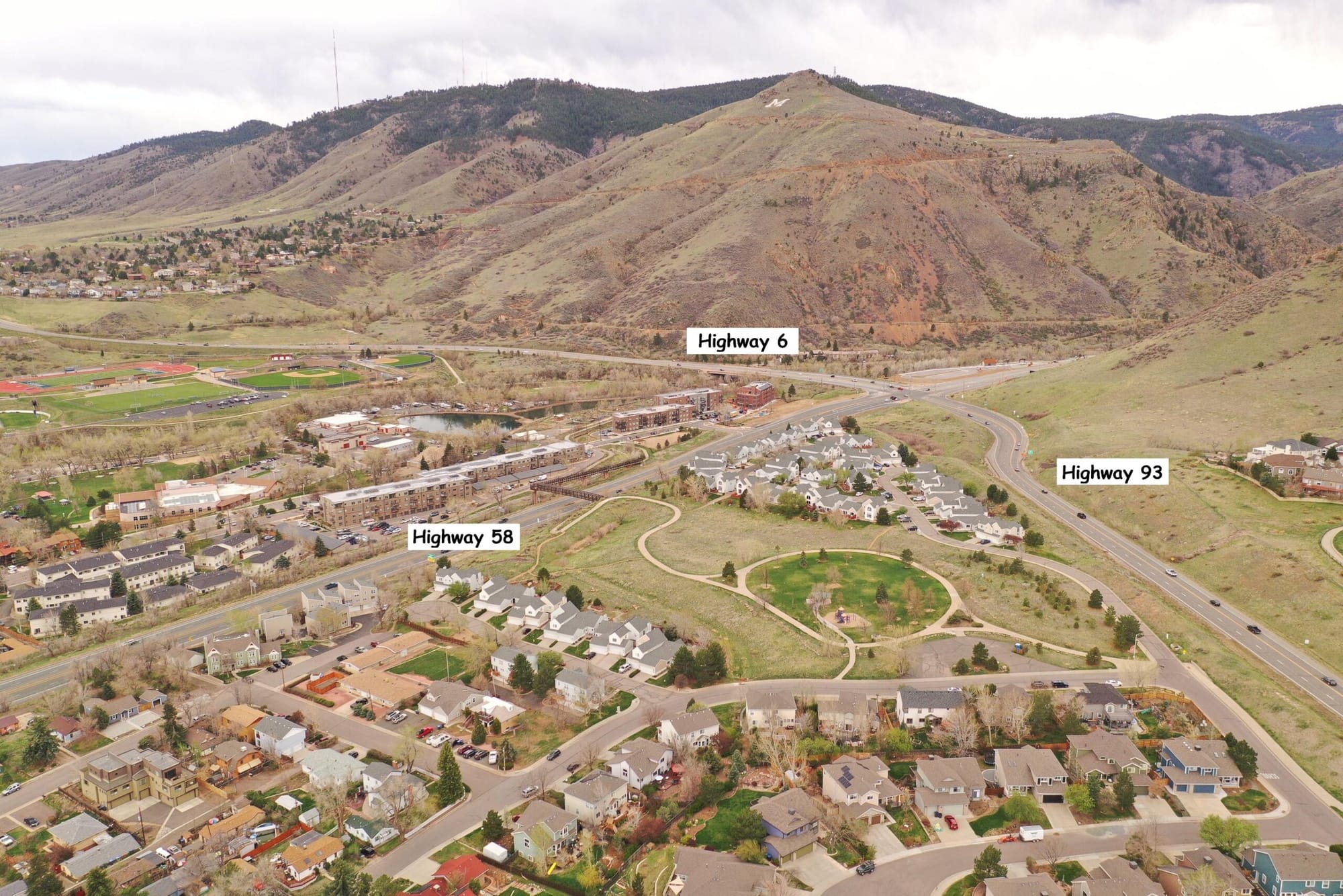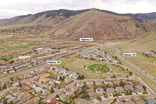 This modern photo shows two additional major roads–Highway 93, coming from Boulder, and Highway 58, coming from Wheat Ridge.