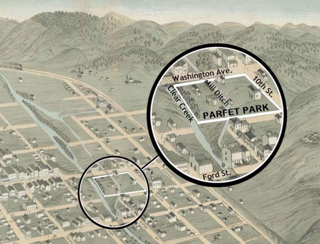The mill ditch was a man-made stream that bisected Parfet Park. It was dug in the 1860s to provide water power to the Golden Mill. The ditch was an attractive hazard for a park, and more than one child drowned there over the years. Later that same year (1953), the City purchased the water rights from the Golden Mill and filled in the ditch.