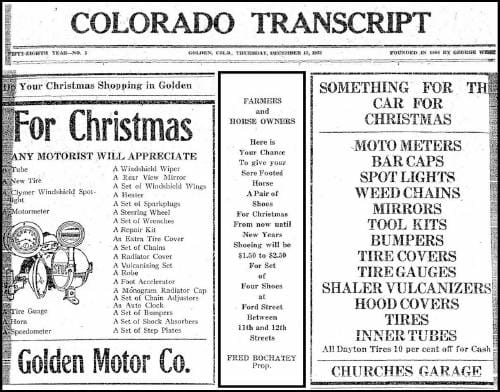 I found the most interesting ads to come from blacksmith Fred Bochatey, Churches Garage, and the Golden Motor Company. Mr. Bochatey said, “Here is your chance to give your sore footed horse a pair of shoes for Christmas.”