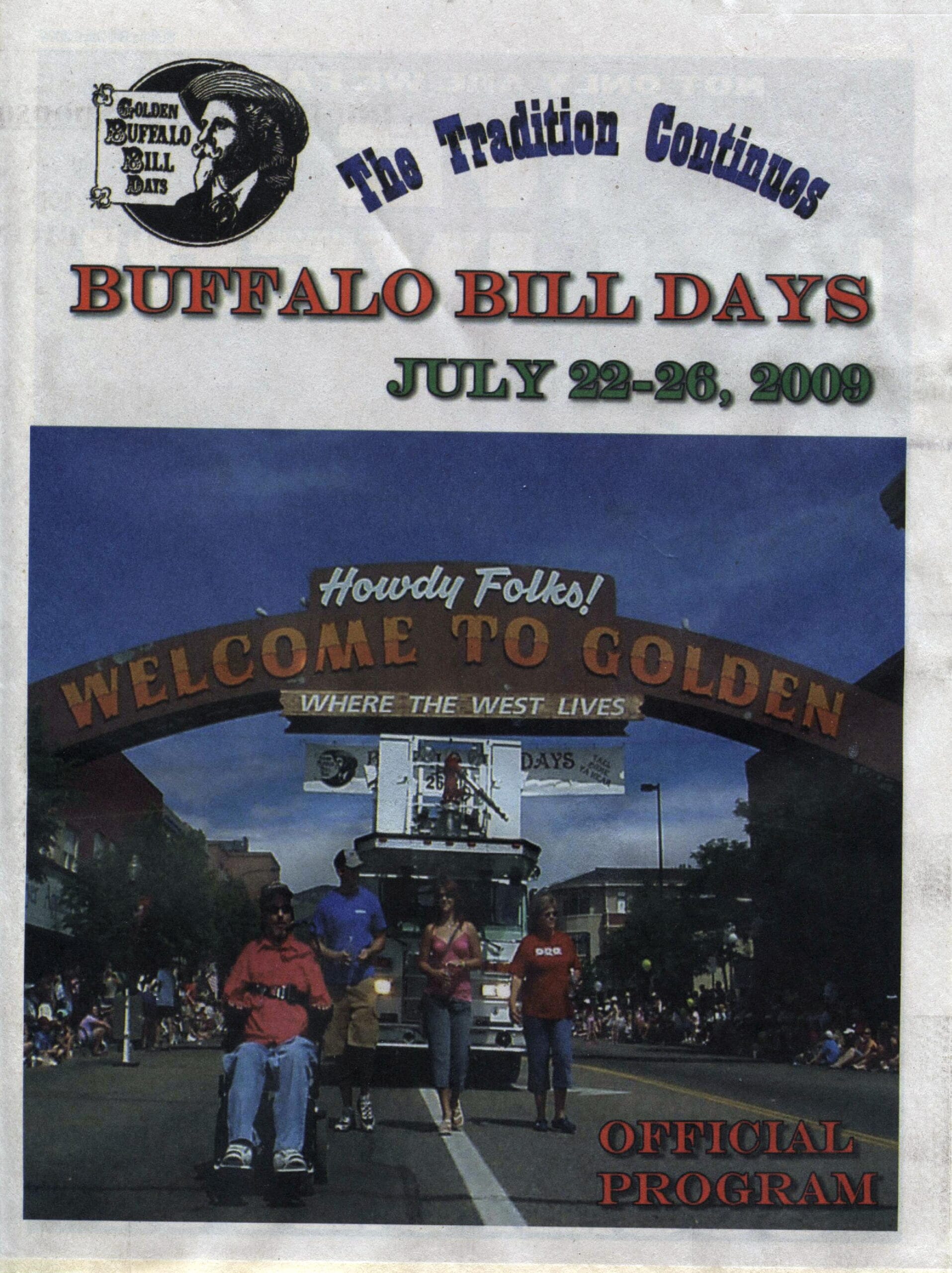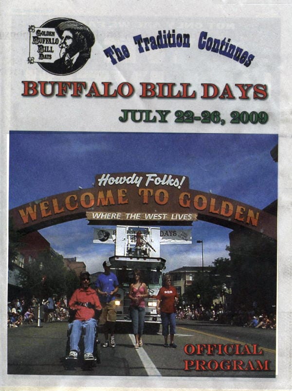 Charlene Pazar loaned me this program from the 2009 Buffalo Bill Days. Many of the traditions have remained unchanged–the pancake breakfast, arts & crafts and children’s activities in Parfet Park, mutton bustin, and of course the big parade on Saturday morning. Others have dropped by the wayside, including the Wild West Show and the rubber duck race down Clear Creek.