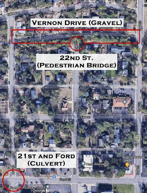 The Welch ditch goes through that neighborhood, and the new roads required bridges to cross the ditch. 21st and 23rd Streets had automobile bridges. 22nd Street dead-ended, with Vernon Drive on the other side of the ditch. City workers were able to build a pedestrian bridge at that spot, thus saving the cost of hiring a construction crew.