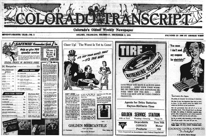 The advertisements in the December 2, 1943 Colorado Transcript show Golden on a wartime footing.