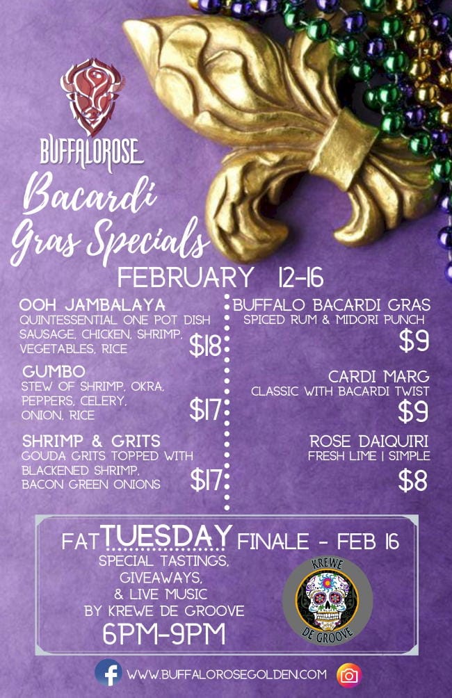 Celebrate Fat Tuesday tonight at the Buffalo Rose, with music by Krewe de Groove and a menu that includes shrimp & grits, jambalaya, and gumbo!