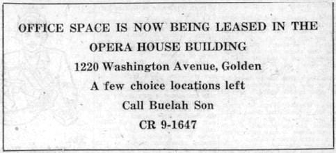 The February 16, 1956 Colorado Transcript urged people to respect the barricades in from of the Opera House building. They stated that the front wall of the structure could crumble at any time. “Warning signs are being torn down and people are walking immediately under the wall that is cracked and leaning at least six inches out over the sidewalk.”