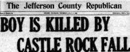 The dance hall on Castle Rock continued to operate, even after the funicular railway shut down. One Saturday night in July of 1925, a carload of boys from Denver arrived, hoping to gain admission. They were turned away at the door, and subsequently two of the boys (brothers Carl and John Milliken) began arguing about whether they should return to Denver. Carl, age 18, marched off, saying he was going to walk to Denver. Instead, he walked off the edge of Castle Rock and fell about 100 feet to the rocks below. His skull was fractured and he died.