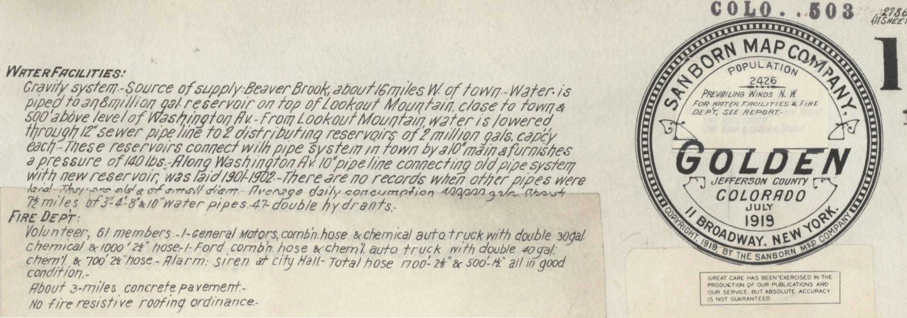 I was also interested in the reference to chemical flame suppressants. The 1919 Sanborn Fire Map describes Golden’s fire fighting capabilities as follows: